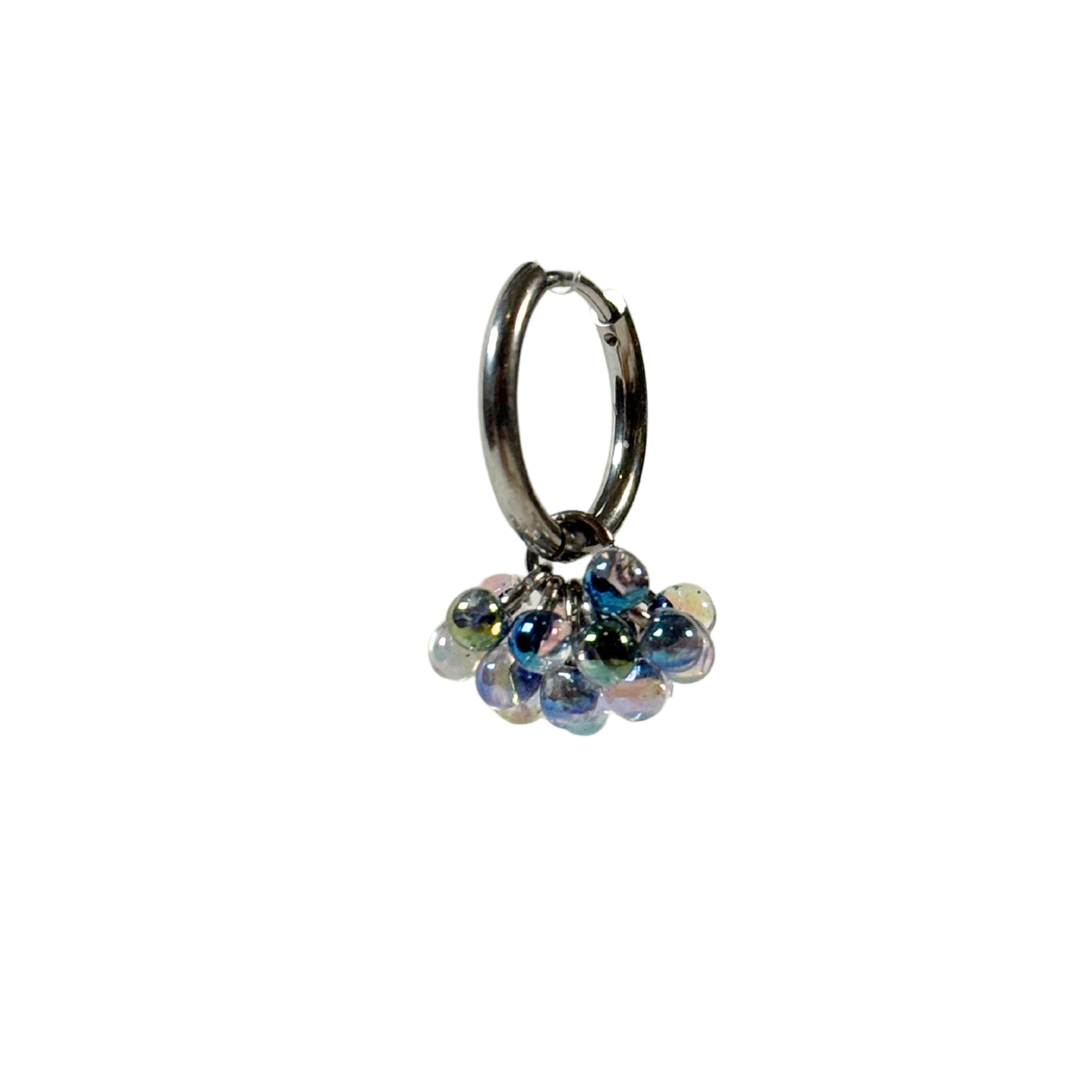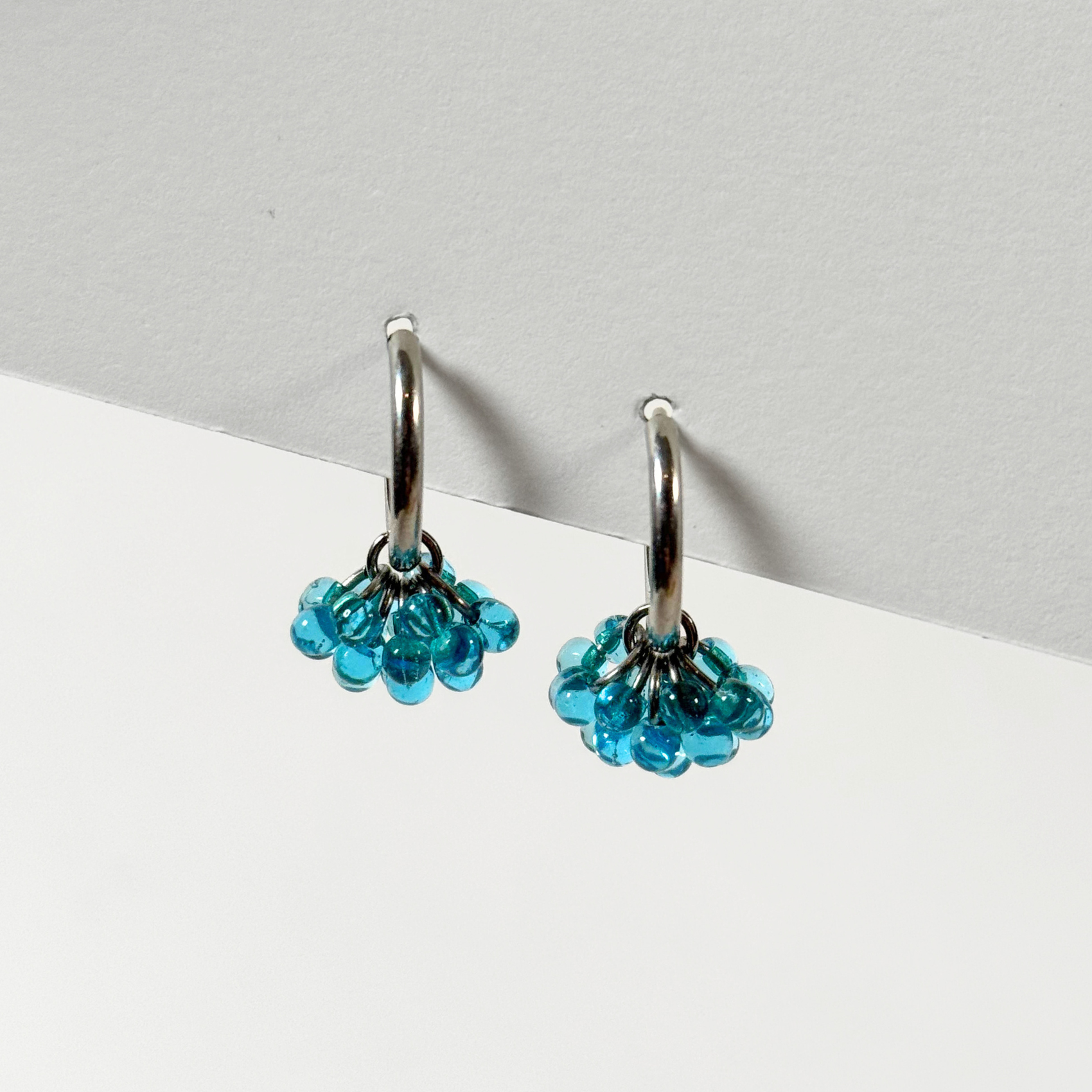 A pair of stainless surgical steel hoop earrings with glass beads.