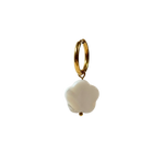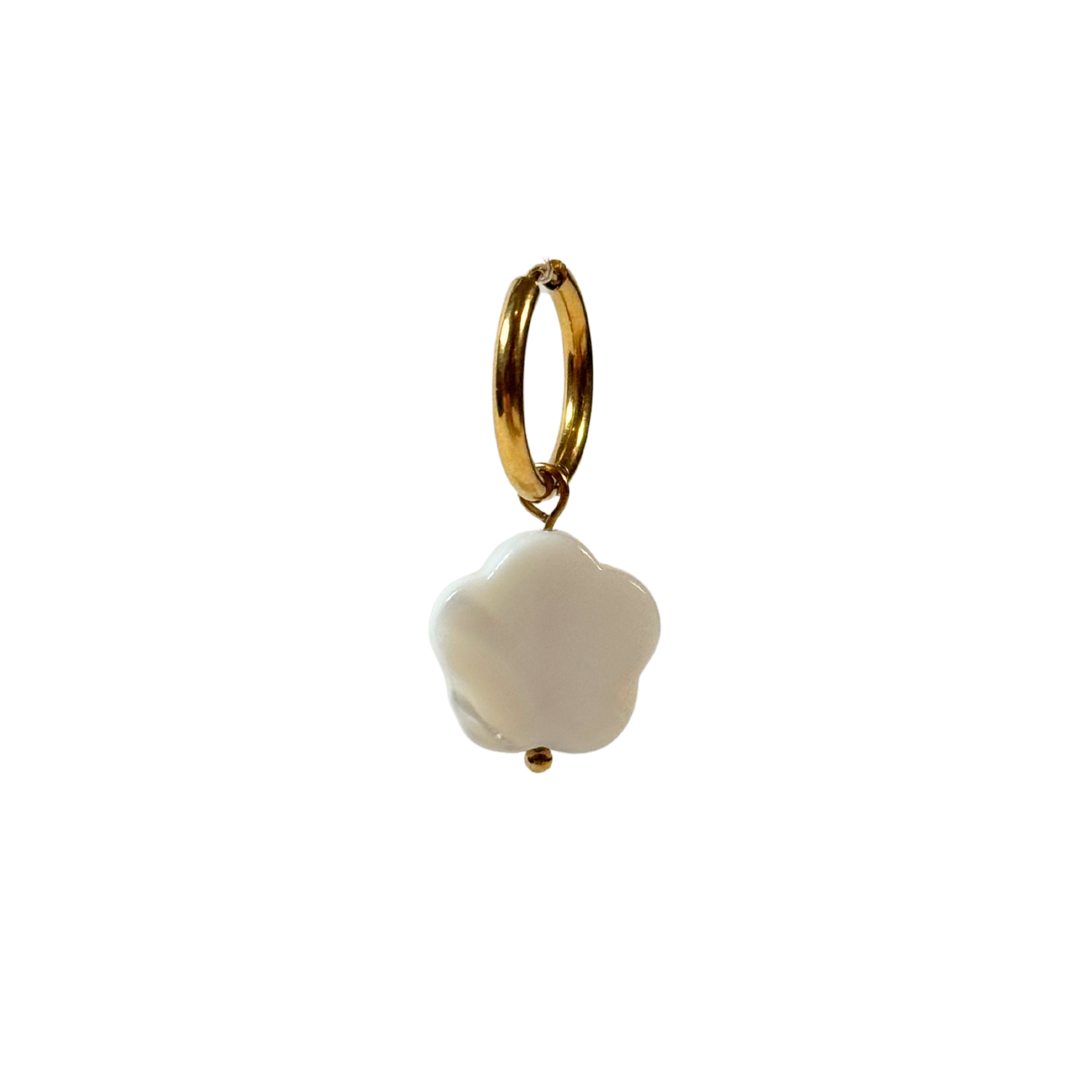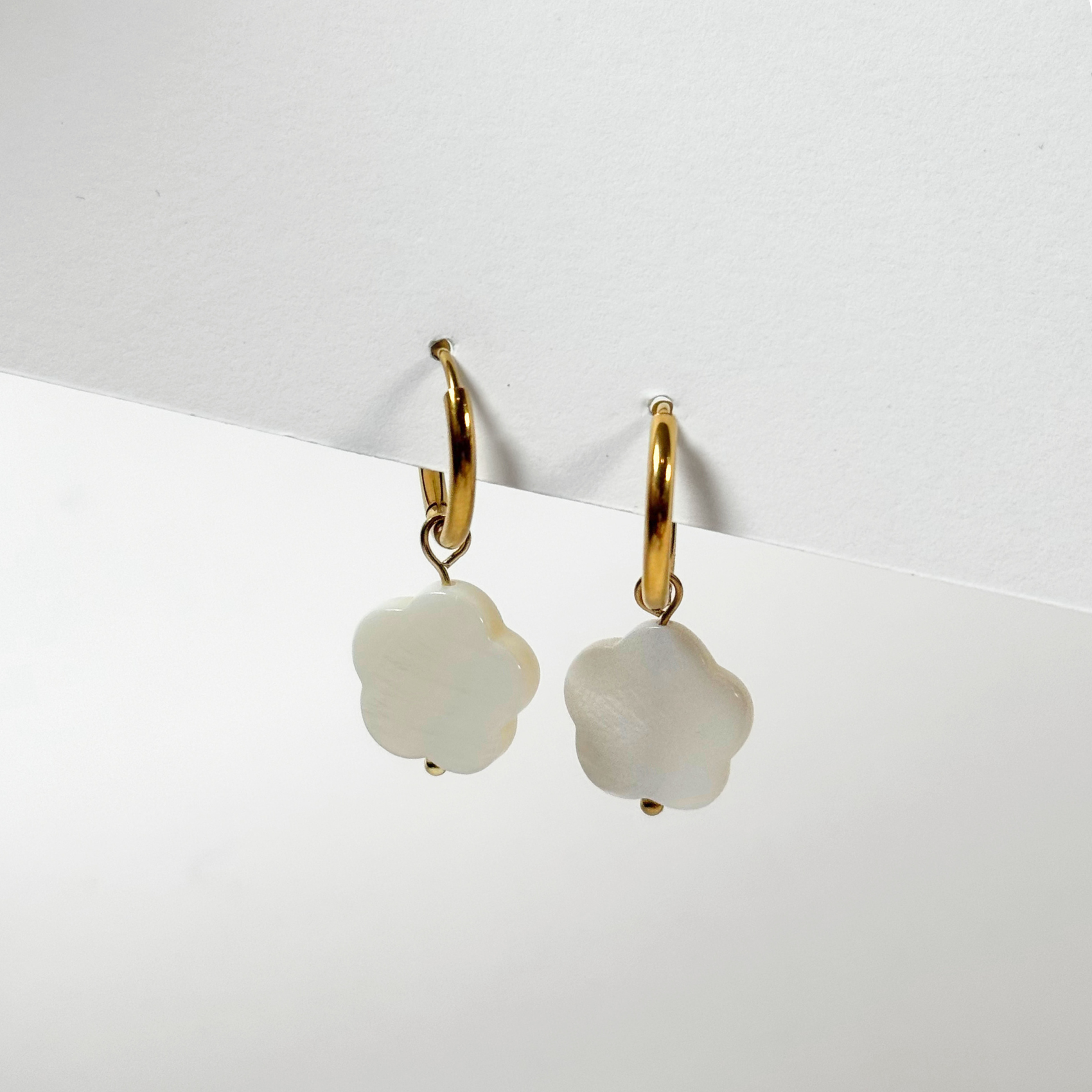 The Fiore earrings feature a flower shaped mother-of-pearl charm paired with PVD-gold-plated hoops. Each piece of mother-of-pearl is unique, making every pair one of a kind. Thanks to PVD gold plating, the hoops have a luxurious shine that is more long-lasting than traditional gold-plated jewelry.
