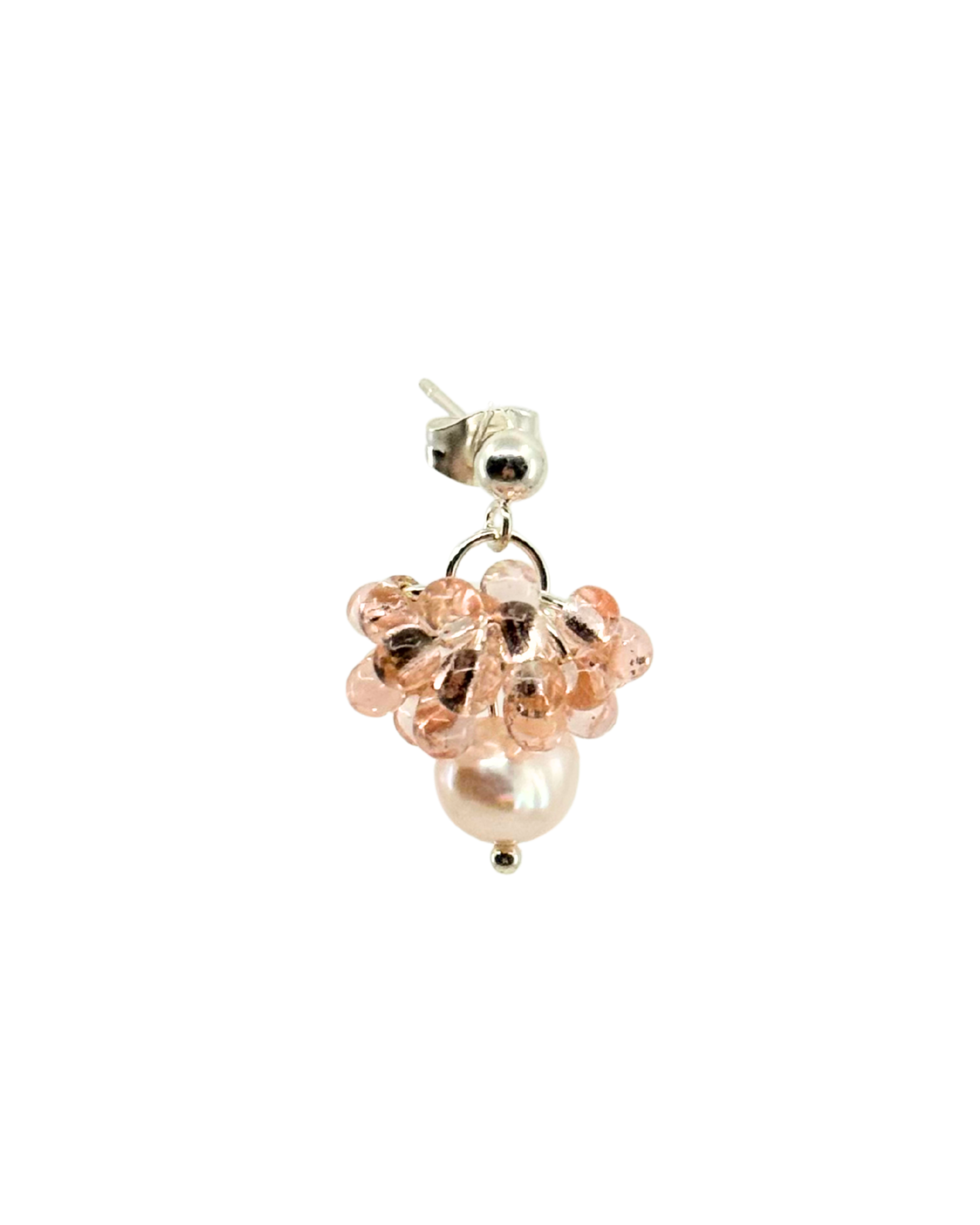 A pair of silver plated earrings with glass beads and freshwater pearls. Each pearl is naturally formed and uniquely individual.