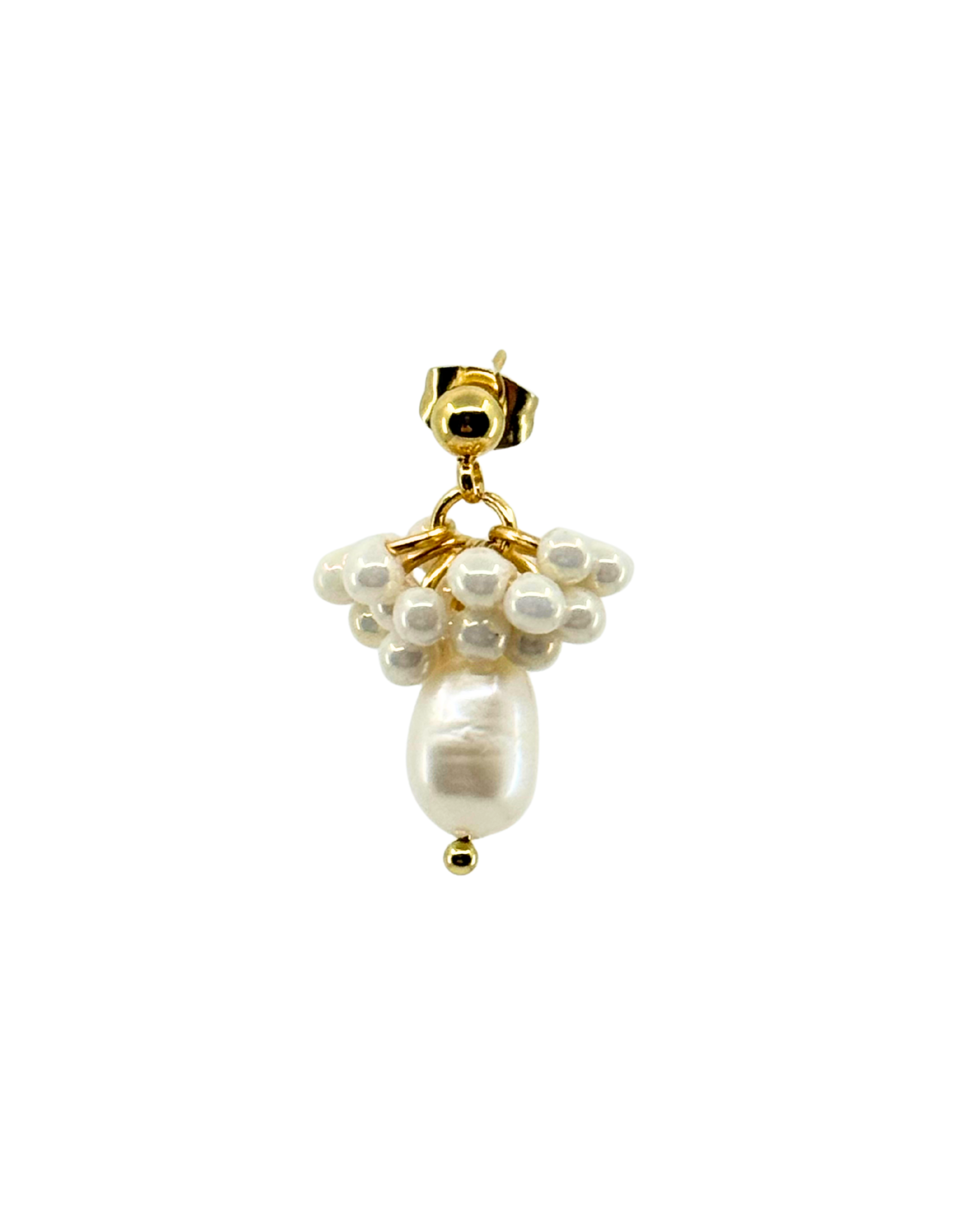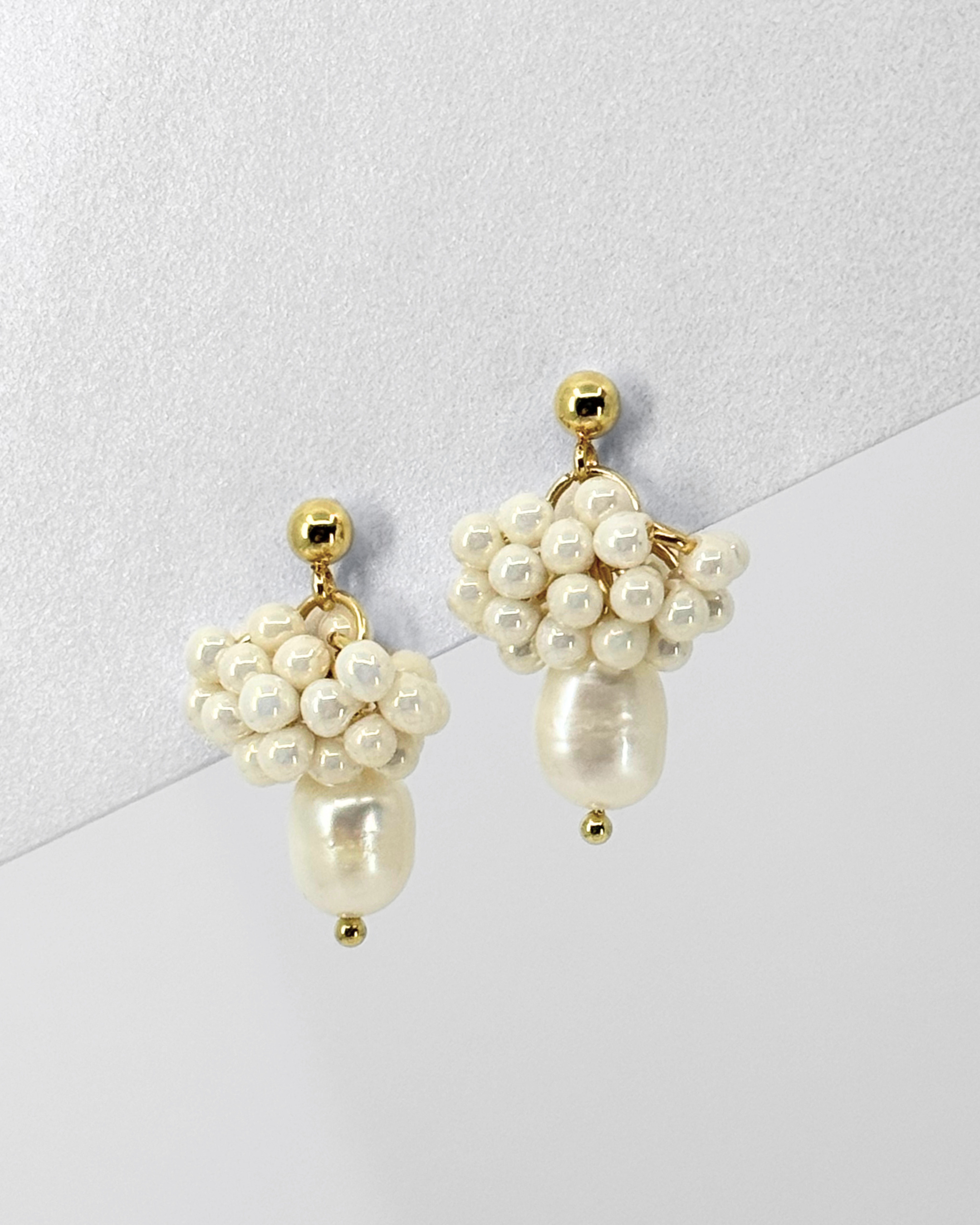 A pair of 18K gold plated earrings with glass beads and freshwater pearls. Each pearl is naturally formed and uniquely individual.