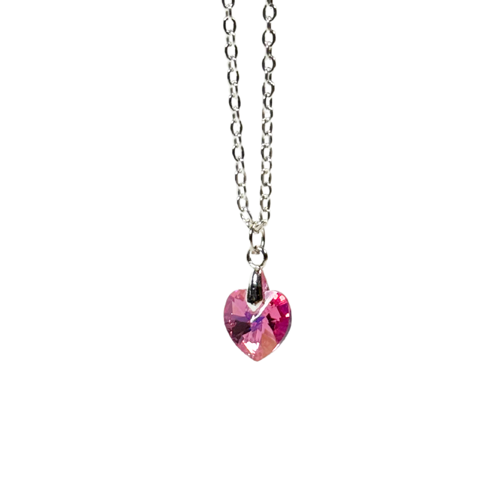 A silver plated necklace with heart-shaped crystals.