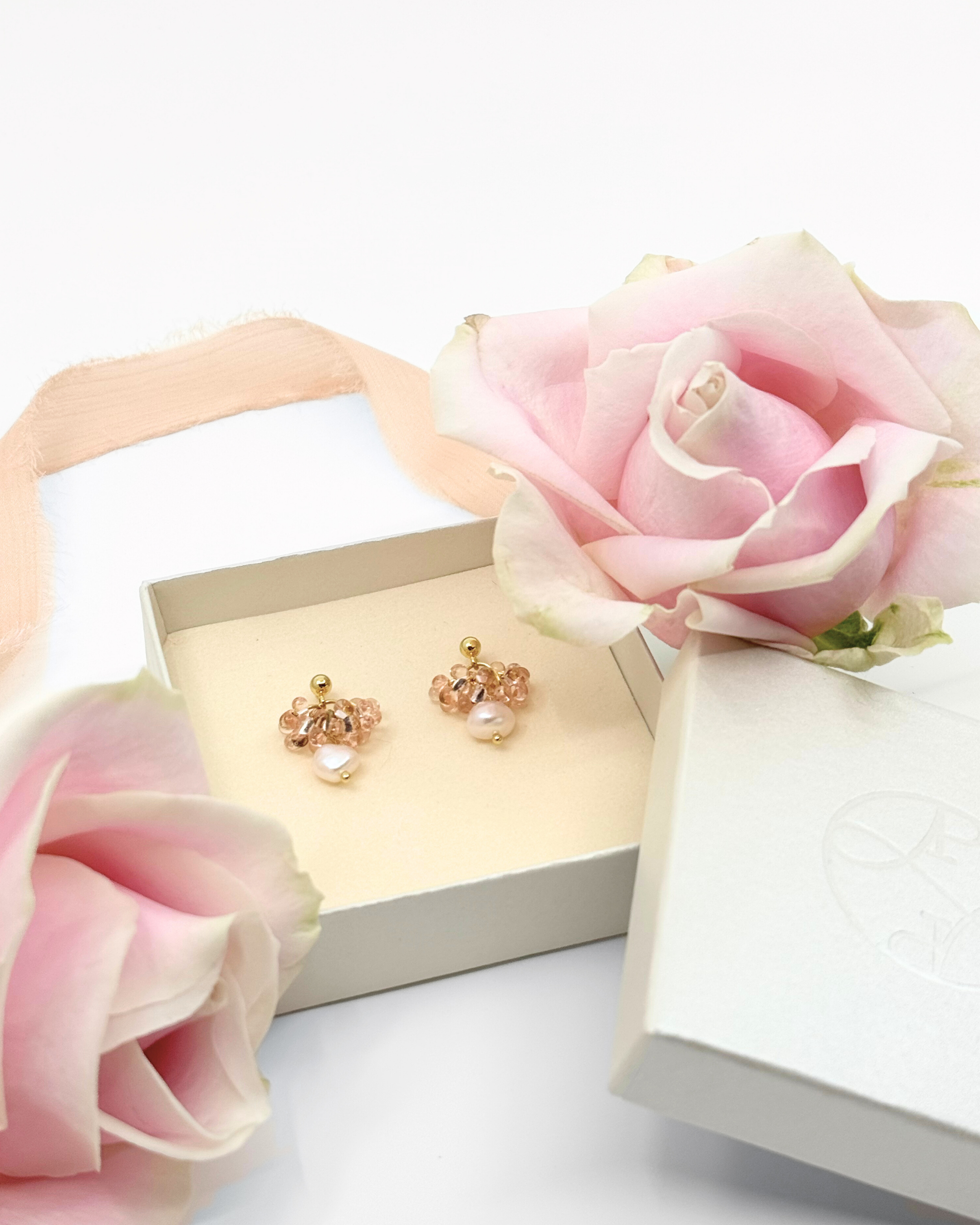 Korvakorut 18k kullattua kirurginterästä, joissa makeanvedenhelmiyksityiskohdat. Korvakoruissa nappikiinnitys.