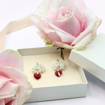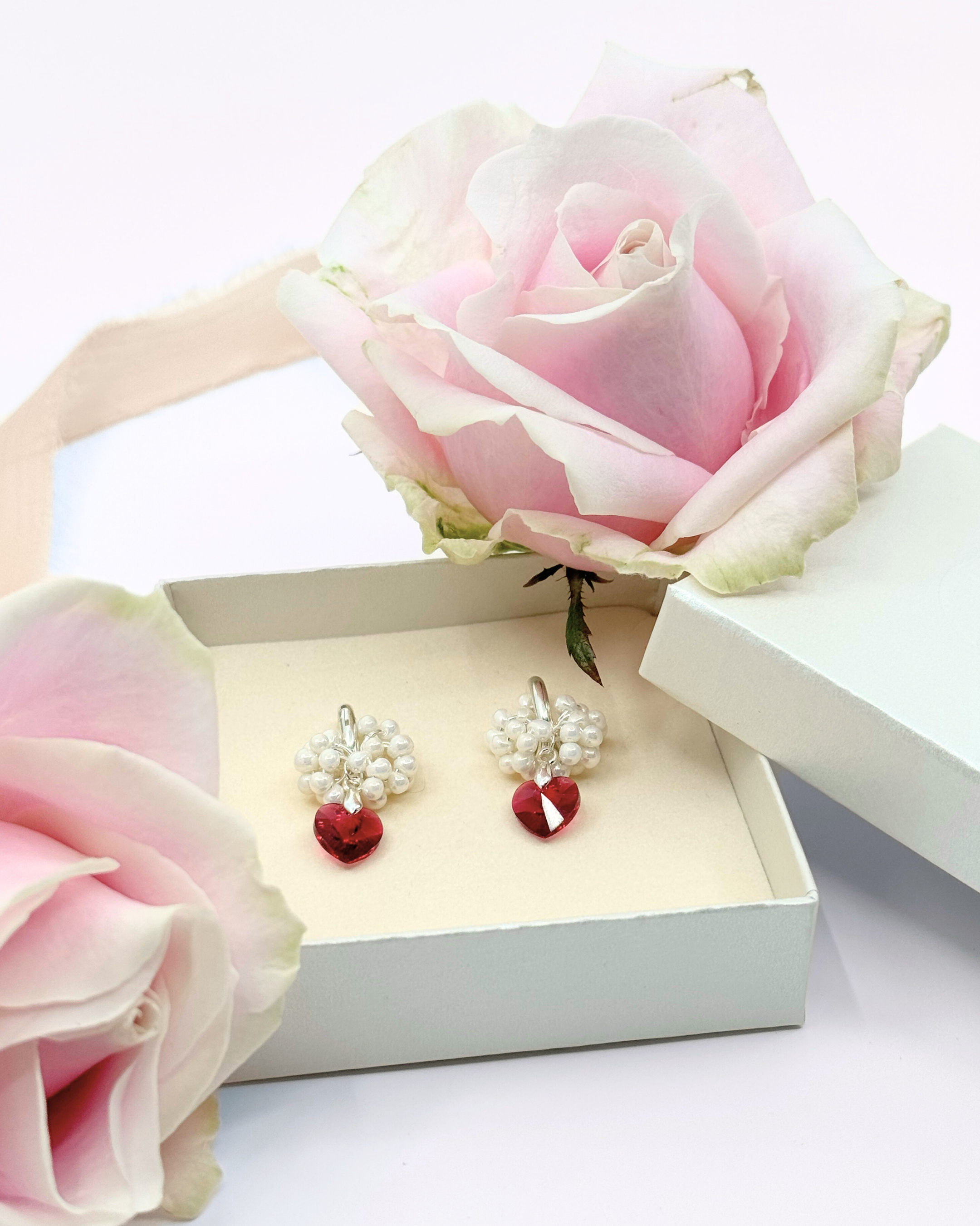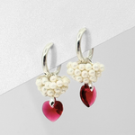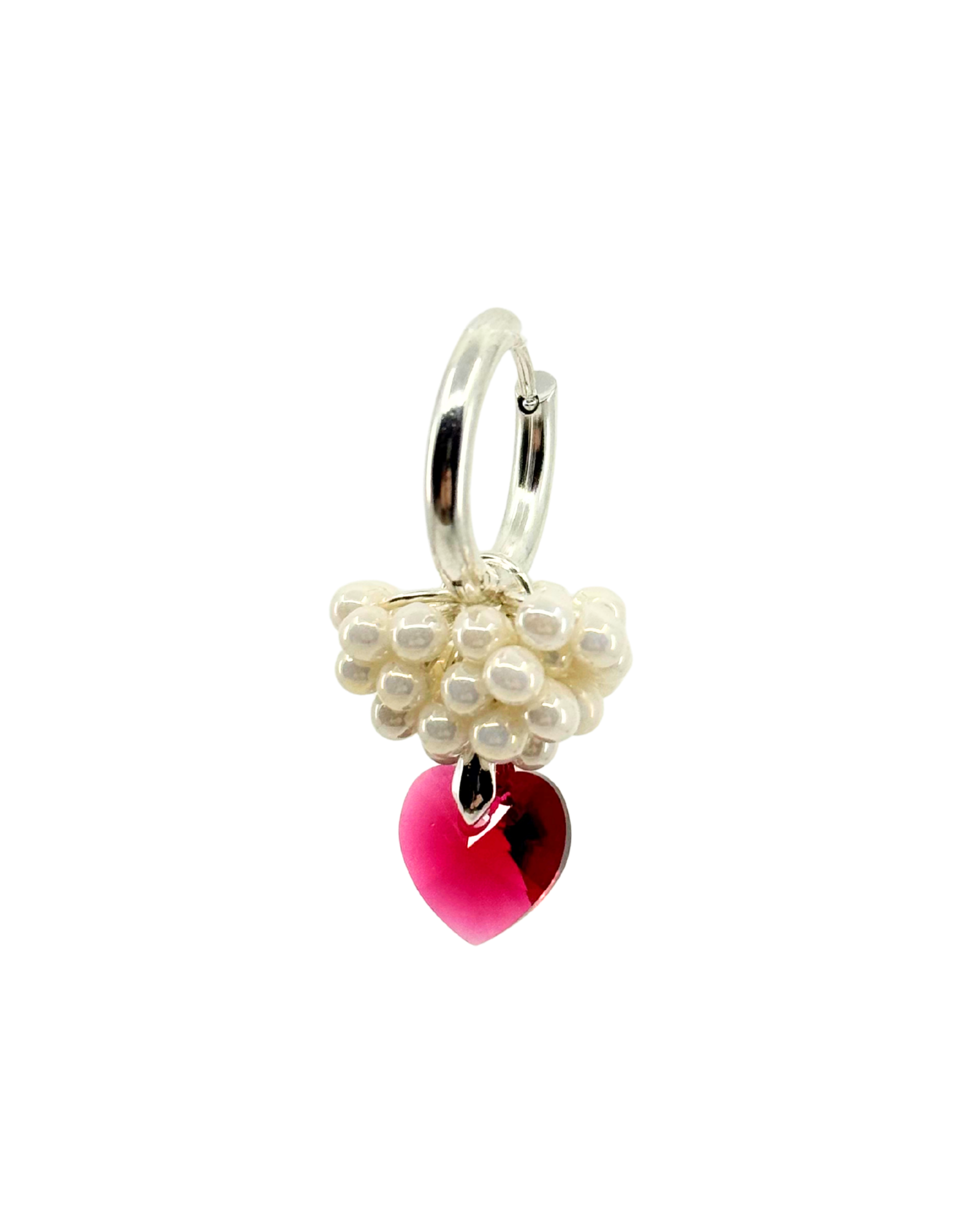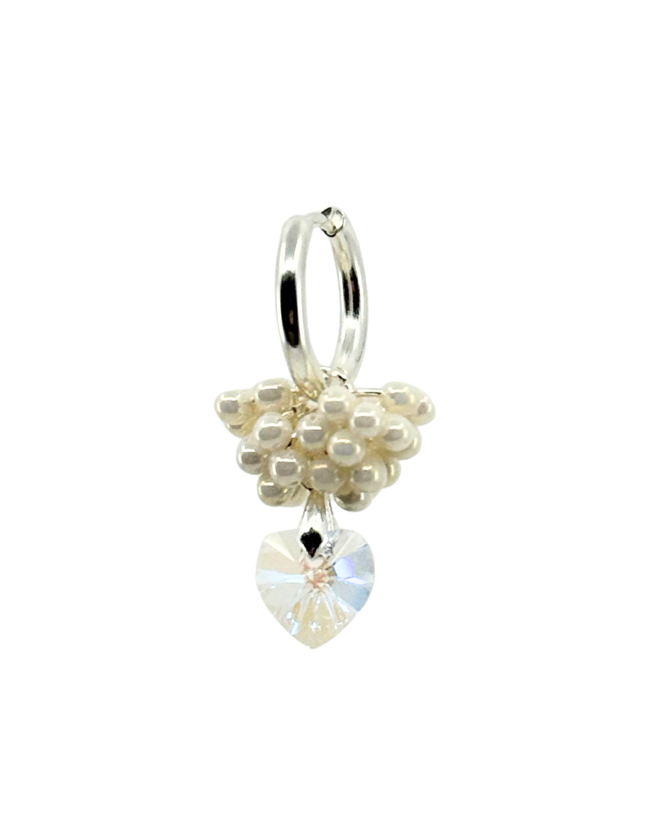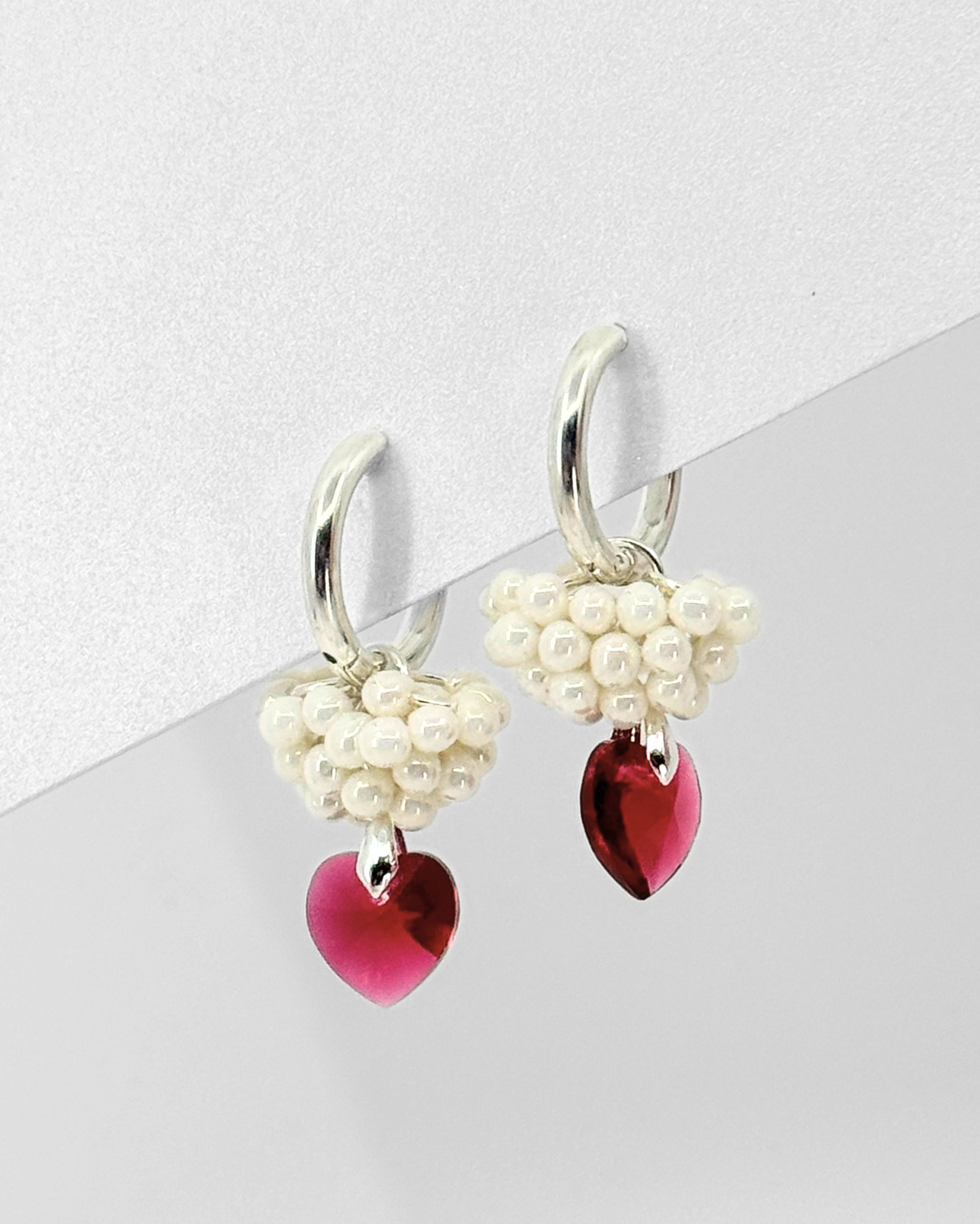 Cuoricini is a statement earring design where pearlescent glass beads meet delicate little hearts which are the inspiration behind the name. The crystal hearts add colour and sparkle to the abundant cluster of pearls, making these earrings the perfect finishing touch when your look calls for a little extra shimmer.